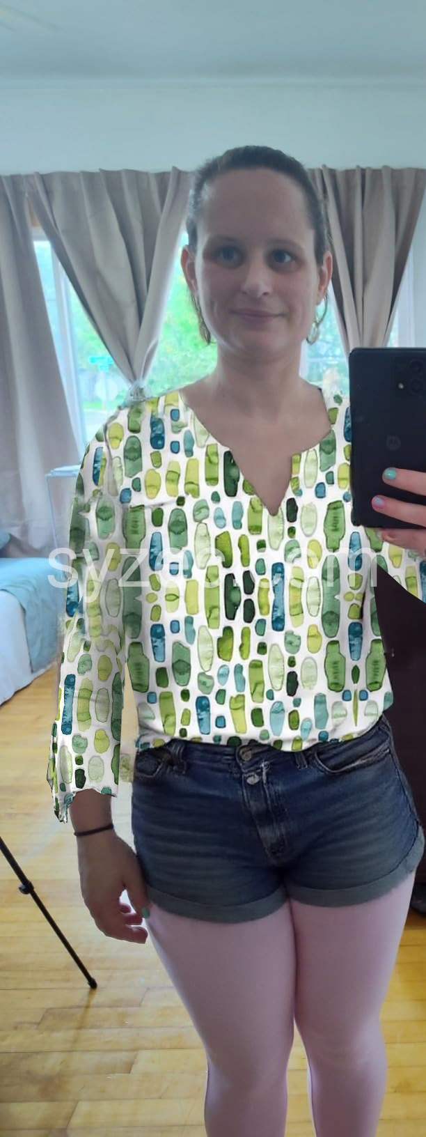 Green Geometric Watercolor Print Notched ¾ Sleeve Top