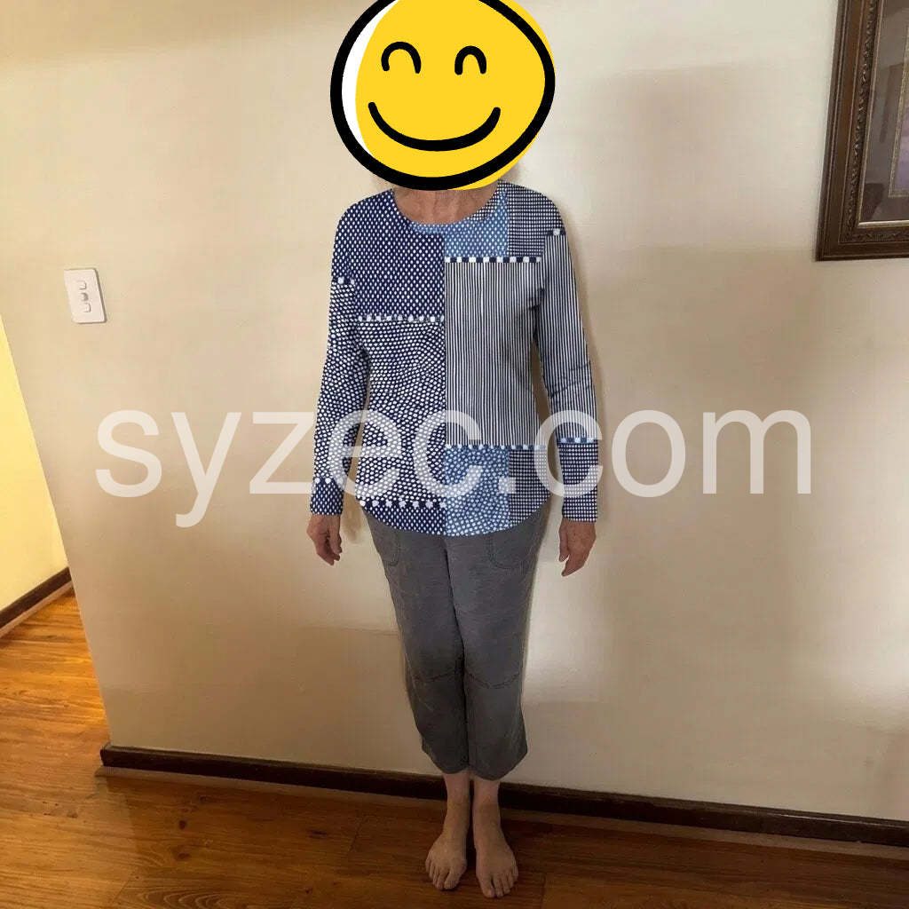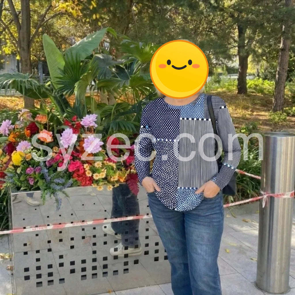 This piece stands out because it blends several patterns into a harmonious whole. The mix includes polka dots, stripes, and small checks, all in a cohesive blue spectrum. It's great for someone who wants to express personality without wearing loud prints. I wore it with a simple white tee underneath for layering when the office air conditioning was strong, and it layered well with a minimalist black blazer.